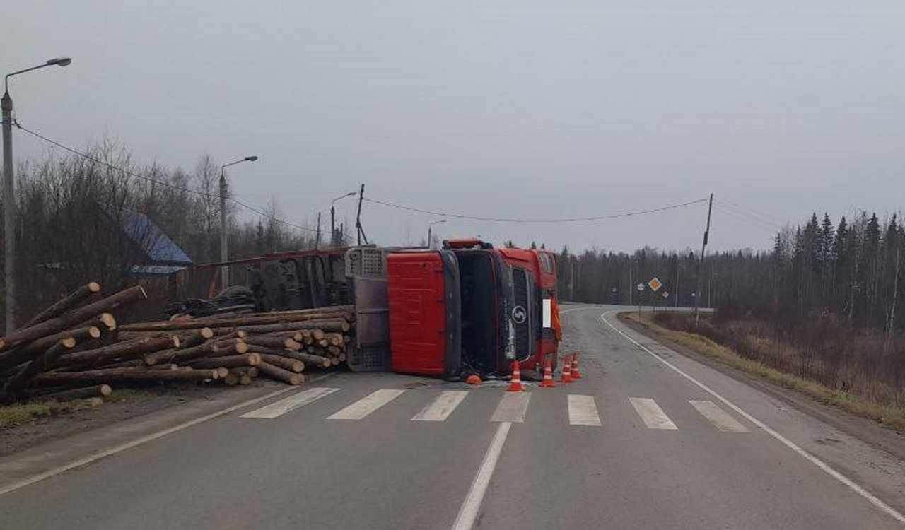 В Мурашинском районе на трассе опрокинулся лесовоз. Авария произошла во вторник, 28 октября, утром на 18 км автодороги «Мураши – Опарино - Скрябино».