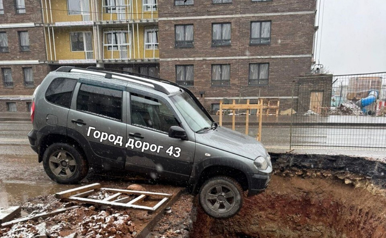 Автомобиль "Нива" повис передними колесами над ямой. Опасная ситуация произошла на улице Попова, сообщают очевидцы. Фото с места происшествия появилось в группе "Город дорог 43".