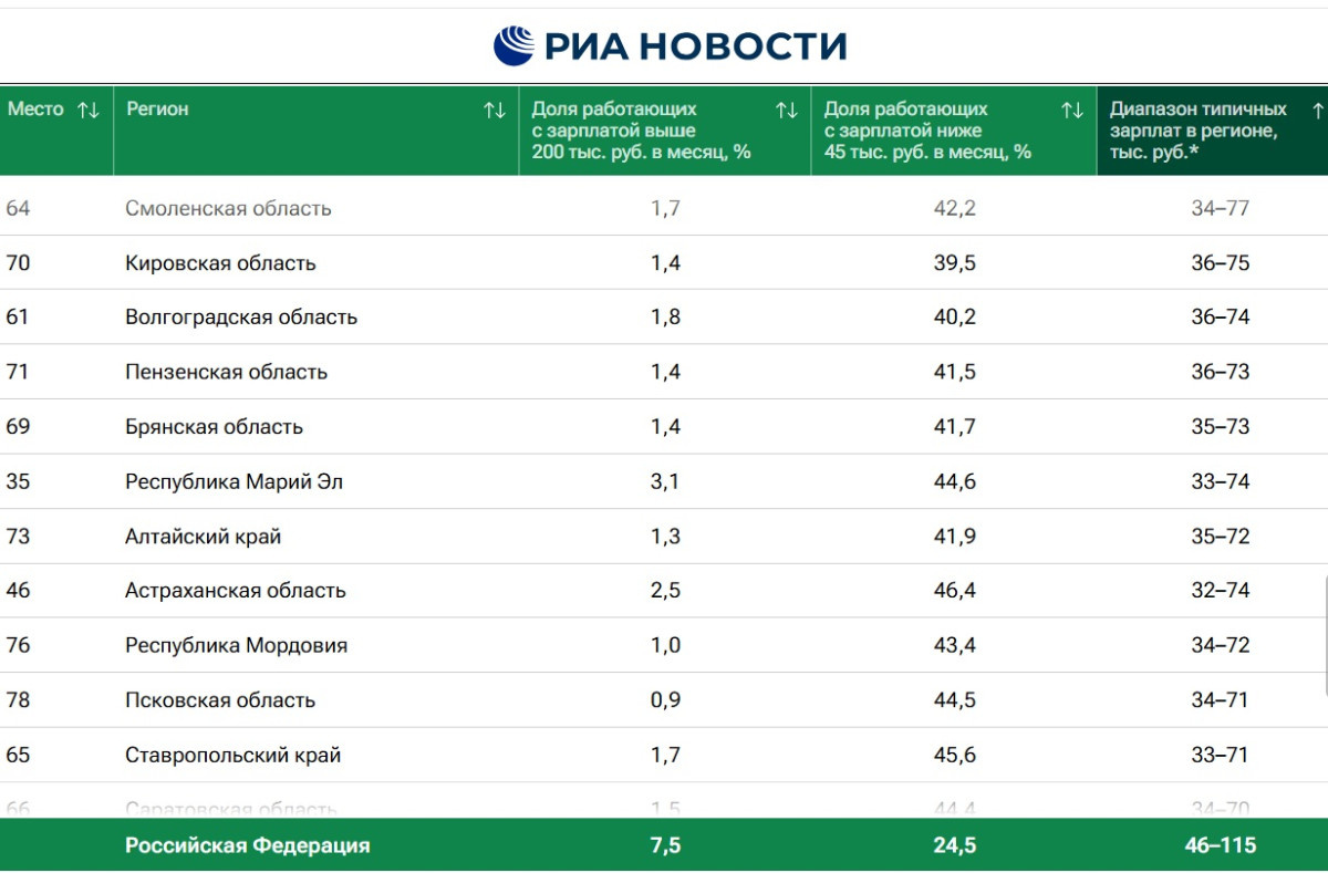 Кировская область находится на 70 месте по уровню и распределению зарплат. Рейтинг составило РИА Новости на основе опроса с сентября 2024 г. по август 2025 г..