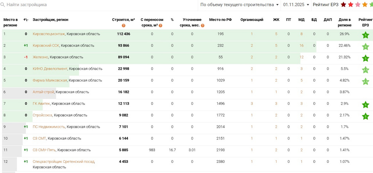 ЕРЗ представил рейтинг застройщиков Кировской области