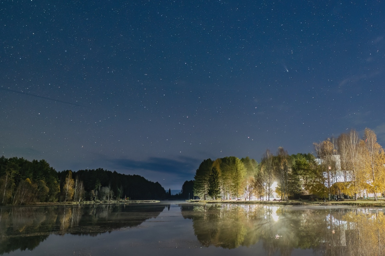 Прошлой ночью на небе показались долгожданные звёзды, и даже замурованная в гипс нога не удержала меня дома, - рассказал кировский фотолюбитель Алексей Шилов. - Потихоньку добрался на костылях до пруда и поснимал набравшую яркость комету C/2025 A6 (Lemmon). Глазами её не смог разглядеть, но через фотоаппарат нашел сразу. При сложении серии снимков в хвосте даже можно различить структуру.